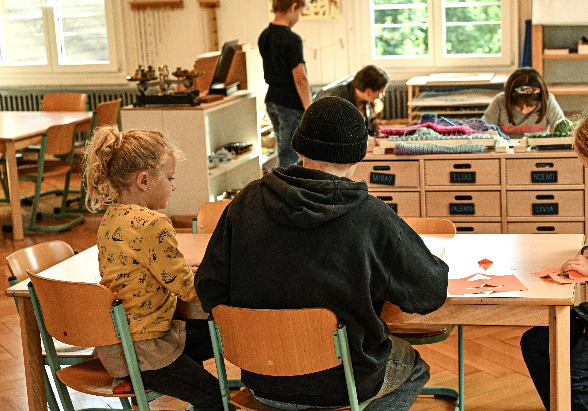 Montessori-Materialien werden mit kantonalen Lehrmitteln und ergänzenden Arbeits- und Spielmaterialien zu einer reichhaltigen Lernumgebung für alle Schulstufen kombiniert.